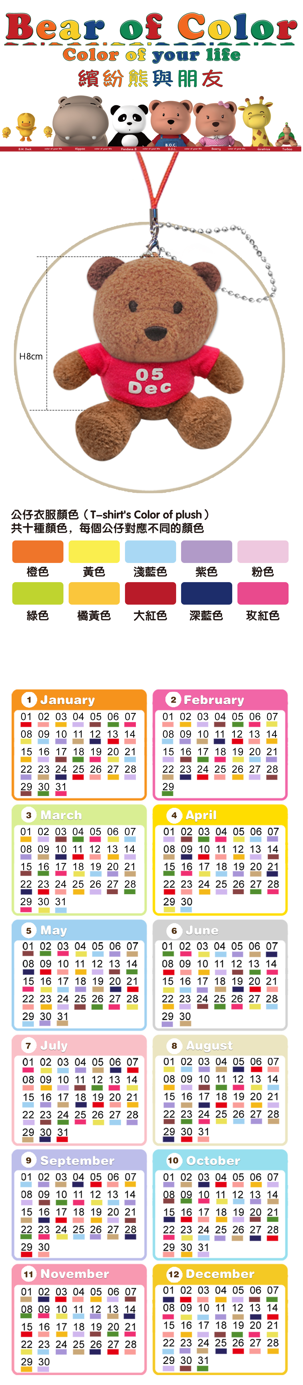 每個日期的衣服顏色是固定尺寸: 坐姿大約 3.5吋 (9cm)